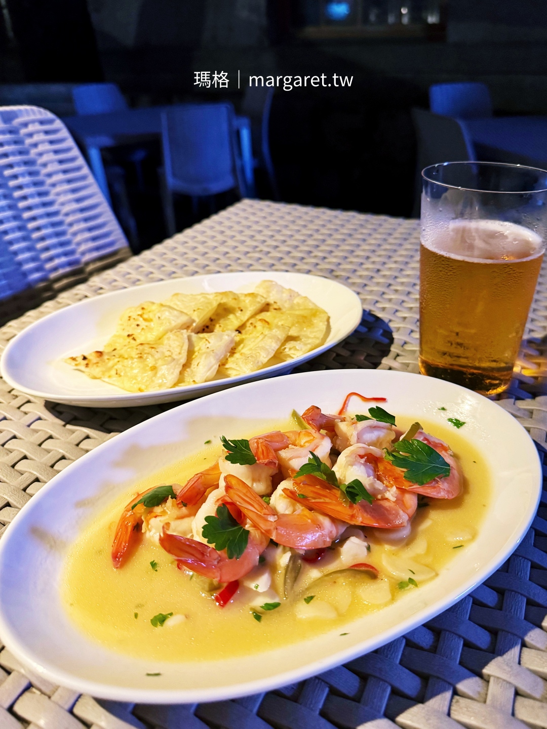 昨天下午到華山光點連看兩場電影,在影片換場短空檔,為了找杯冰咖啡,意外被「SipSip Bar & Restaurant」吸引,在等咖啡的時刻,我注意到這家餐廳的空間頗有特色,菜單上有一些創意餐酒,讓我決定電影散場後過來吃飯喝一杯。在店員推薦下,我點了一道「剝皮辣椒奶油鳳尾蝦」,加價搭配蒜香起司烤餅,搭配冰涼的三得利生啤酒,坐在露天席享受晚間的微風,耳際飄來園區角落不知什麼歌手正演唱著「我隨時都在」,好愜意啊。